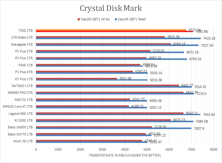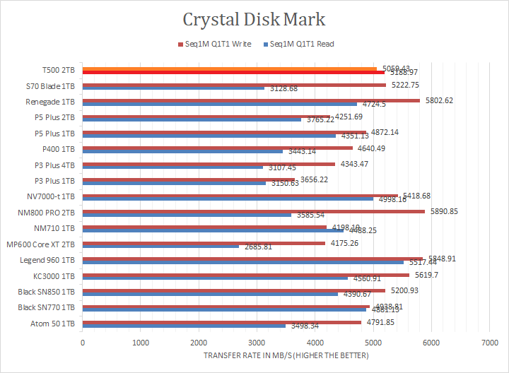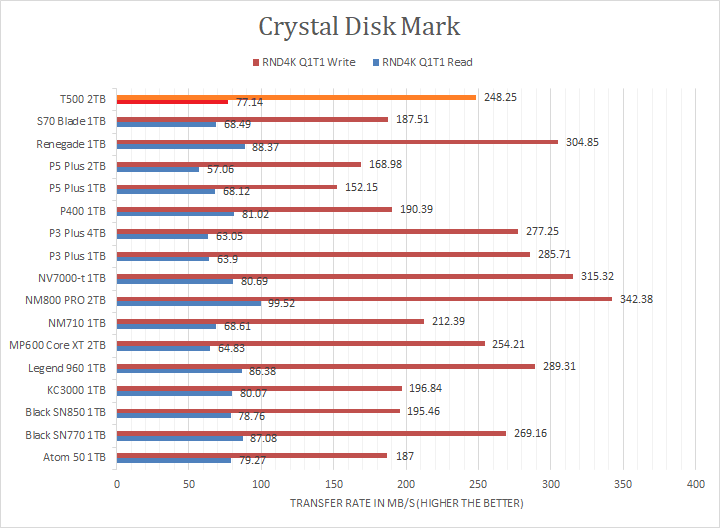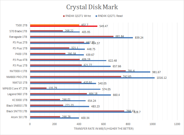 Crucial claims the T500 2TB's maximum read and maximum write are pinned at 7400MB/s and 7000MB/s, respectively. Looking at the read and write results, the T500 2TB was in the upper half or near the top in the sequential read and write sections against other PCIe 4.0 NVMe drives, but this was to be expected. The tested numbers were slightly lower than expected compared to the specifications. However, its fortunes were reversed in the RND4K tests, where its results were in the ballpark of other budget mainstream rather than performance drives. I will let you make your own comparisons in our list of NVMe SSDs in the graphs above.