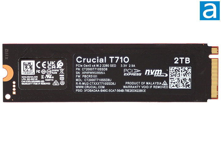 The Crucial T710 2TB is an M.2 2280 format SSD. If you are not familiar with the M.2 physical standard, M.2 2280 means the size of the drive is 22mm by 80mm, hence its numerical designation. Its components are located on the black printed circuit board located behind the label, which we will take a closer look at in just a moment. The Crucial T710 2TB works on the NVMe 2.0 logical device interface, and plugs into compatible motherboards directly. Electrically, M.2 NVMe interfaces with PCIe 5.0. The T710 uses four lanes for up to 16,000MB/s bandwidth in each direction. The weight is unspecified, but I cannot imagine it to be any heavier than any other M.2 2280 format SSD.