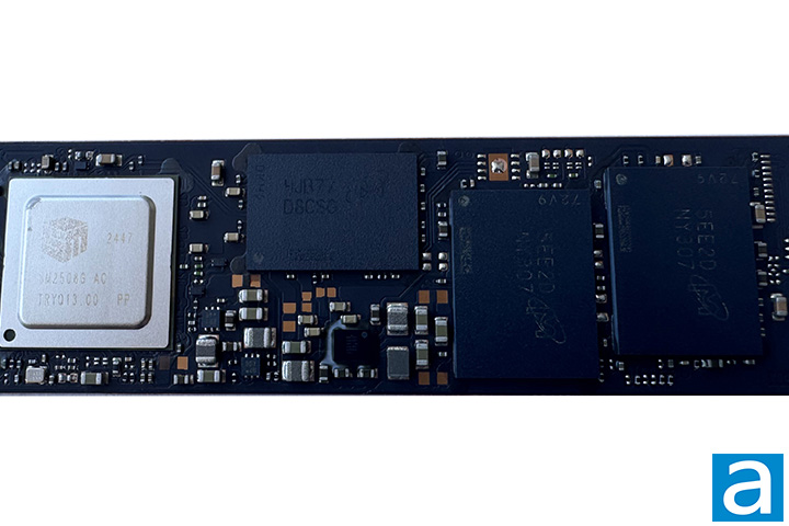 Remove the label and zoom in a bit, and you can see what the Crucial T710 2TB is made from. There are four key components that can be seen. At the heart of Crucial's T710 2TB is a Silicon Motion SM2508. It is an NVMe solution on the M.2 socket to utilize the bandwidth afforded by the PCIe 5.0 standard. The SM2508 is built on TSMC's 6nm process, features a quad core ARM Cortex R8 CPU, eight NAND channels, and uses only 3.5W maximum in active mode. The controller also has native full drive encryption support. A Micron D8CSG, decoded as MT53E512M32D1ZW-046, LPDDR4-2133 2GB memory chip is present. It is used by the controller for system memory. SSD DRAM is used as a cache for writing data to the drive and storing a table that maps where each logical block address is physically located on the NAND flash memory.