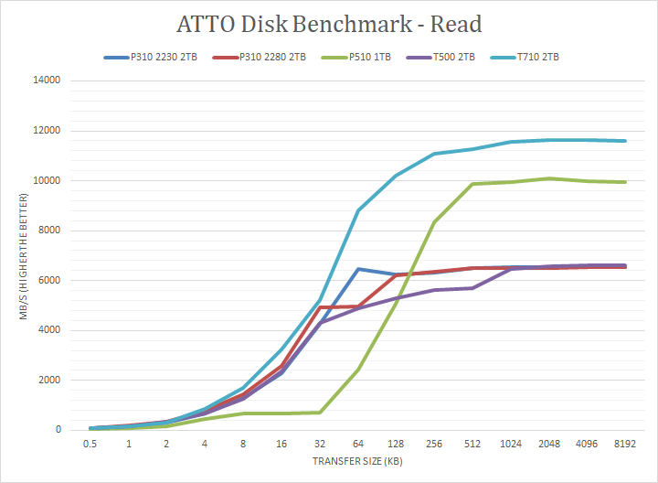 As far as the Silicon Motion SM2508 controller on the T710 2TB is concerned, well, here are our results. The Crucial T710 2TB peaked at 11630MB/s read and 12630MB/s write. Under the read curve, it was in the ballpark as all the compared drives between 0.5K and 2K, and quickly and absolutely ran away at 4K and above.