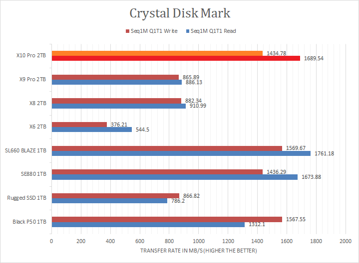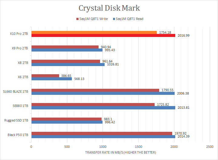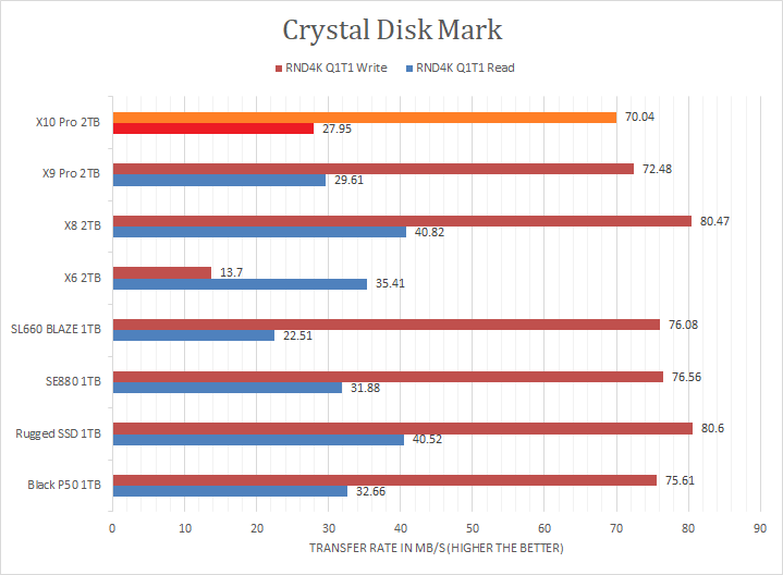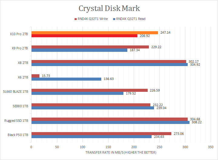 Crucial claims the X10 Pro 2TB's maximum read and maximum write are pinned at 2100MB/s and 2000MB/s, respectively. Looking at the read and write results of all four sections, the X10 Pro 2TB was totally untouchable in its sequential read and write section along with other USB 3.2 Gen 2x2 drives, but falling slightly short of the specifications in both categories. The random read and write results were a bit different than the linear numbers though. In the RND4K Q32T1 tests, it was no match against the Crucial X8 2TB and LaCie Rugged SSD 1TB, but remained mostly in the same ballpark as the Western Digital Black P50 Game Drive SSD 1TB, Lexar SL660 BLAZE 1TB, and ADATA Elite SE880 1TB. Lastly, in the RND4K Q1T1 segment, we see the exact same pattern. I will let you make your own comparisons in our array of external USB SSDs in the graphs above.