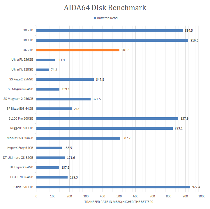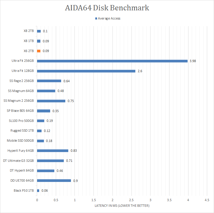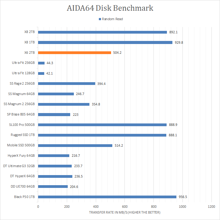 As with all our portable disk reviews, I would just like to make it clear from the start that we are, by no means, expecting the compared USB flash drives on the list to deliver performance competitive with the Crucial X6 2TB external solid state drive. However, our AIDA64 results do provide interesting insight to the performance of the Crucial X6 2TB as a USB 3.1 Gen 2 storage device. Delivering up to 509.9MB/s sequential read, 504.2MB/s random read, and 501.3MB/s buffered read, this is about what we expect for a Serial ATA-based device. It was marginally slower than the LaCie Mobile SSD 500GB, but obviously no match for NVMe-based devices like the Crucial X8 and LaCie Rugged SSD. Its 0.09 ms random access time is what you would expect from a USB solid state drive as well. So far, for 2TB of USB 3.1 Gen 2 budget storage, this is within expectations.