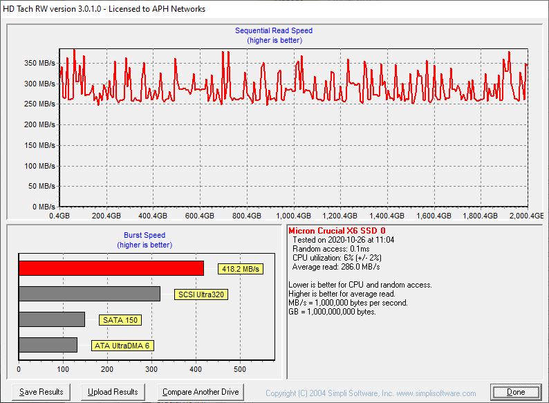 Now, it is the time for good old HD Tach. While HD Tach is more of a drag race than a clear indication of real life performance and has been around for a really long time, it is an excellent storage performance reference among removable storage drives and has been our favorite benchmark long before internal hard drives even cracked the 50MB/s mark. From that above, I was able to pull a very good 286.0MB/s average. This is better than the LaCie Mobile SSD 500GB's 233.9MB/s average in the same test. As you can see in our screenshot above, the tested latency was 0.1 ms, which is the same as our AIDA64 results on Page 3 of this review. Once again, the performance Crucial X6 2TB was well within expectations for its performance class.