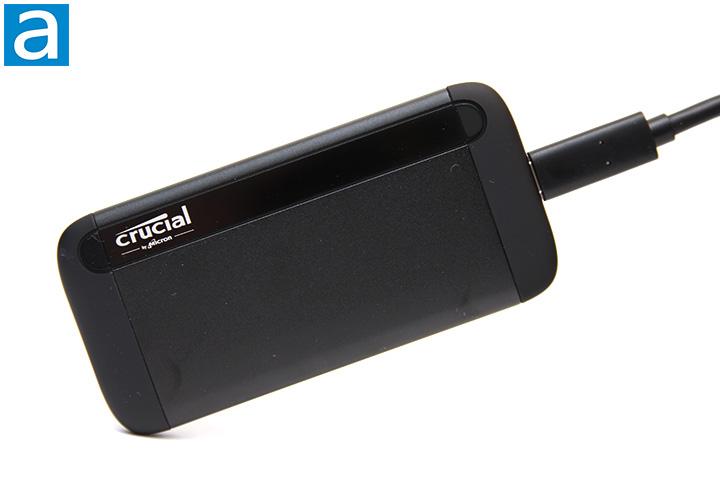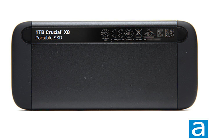 Crucial has always been a company that is all about business, and the X8 is there to help you keep that impression. The rounded corners and curved surfaces look classic and conservative. A piano black strip at the top contains Crucial's logo. Meanwhile, distinct lines mark where the surface of the aluminum enclosure ends and the plastic caps start. Aluminum is lightweight and great for heat dissipation to prevent thermal throttling, and the matte black finish is mostly fingerprint resistant. All in all, I found this slim and sleek solid state drive feels solid and flexes to nothing.
