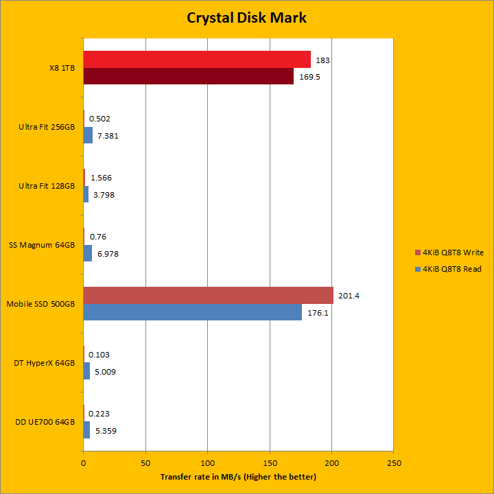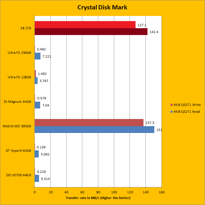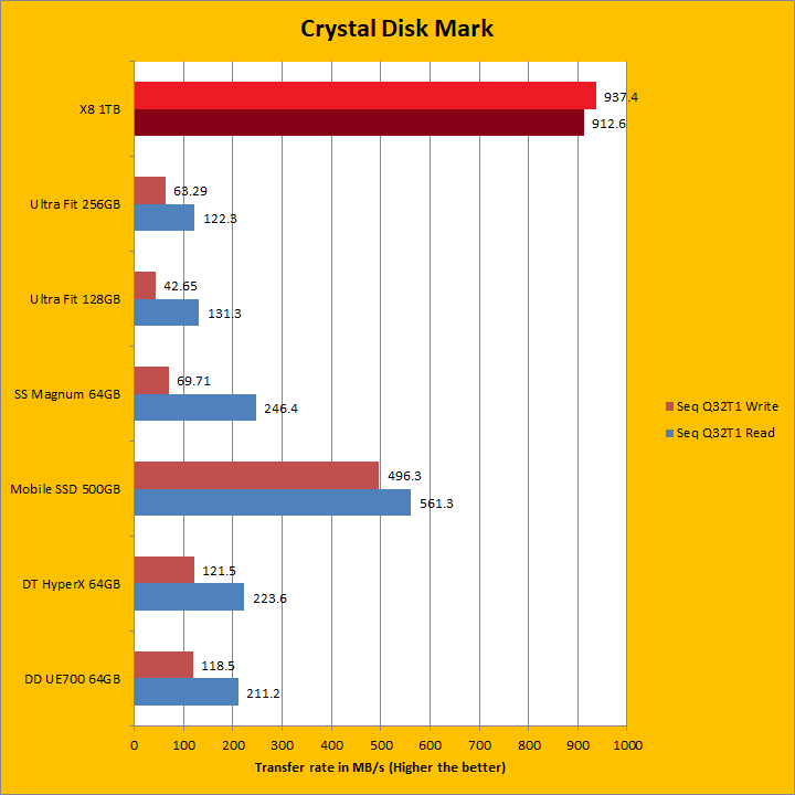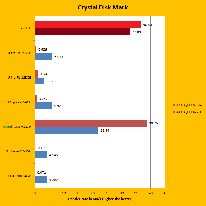 The Crucial X8 1TB continued to dominate as we move into our Crystal Disk Mark sequential read and write results. Once again, it crushed everything else, but this is to be expected given there is an NVMe drive inside. Its sequential read and write results generally reflect what we have seen in the past two pages. At 937.4MB/s sequential read and 912.6MB/s sequential write, it fell a bit short compared to the advertised numbers this time around, but we already got it in ATTO. As we move into the 4KiB Q8T8, 4KiB Q32T1, and Q1T1 territories, which require high input/out operations per second or IOPS, the Crucial X8 1TB continued to blow all the other tested USB flash drives out of the water, but was not as fast as the LaCie Mobile SSD in all but one test. Traditionally, this has always been a weak point for USB flash drives and a strong point for solid state drives as we can see here.