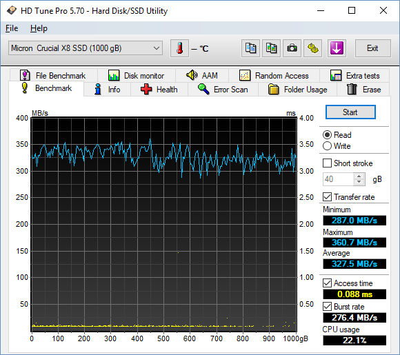 Unfortunately, HD Tune does not generate any fancy independent graph outputs in particular, so I just took a screenshot of the program. The Crucial X8 1TB remained very flat on average. It differed slightly in magnitude than HD Tach -- probably due to testing algorithms used -- but its performance characteristics were identical in practice. Other than that, the results were top tier across the range; the recorded access time was very low as we would expect from an external solid state drive. The X8 1TB posted an average of 327.5MB/s for its sequential read speed, which is, again, much faster than the LaCie Mobile SSD 500GB at 220.0MB/s. The Crucial X8 1TB's tested latency was identical after rounding compared to AIDA64 and HD Tach at 0.088 ms. Do keep in mind the discussion we had on the previous page, as it still applies here.