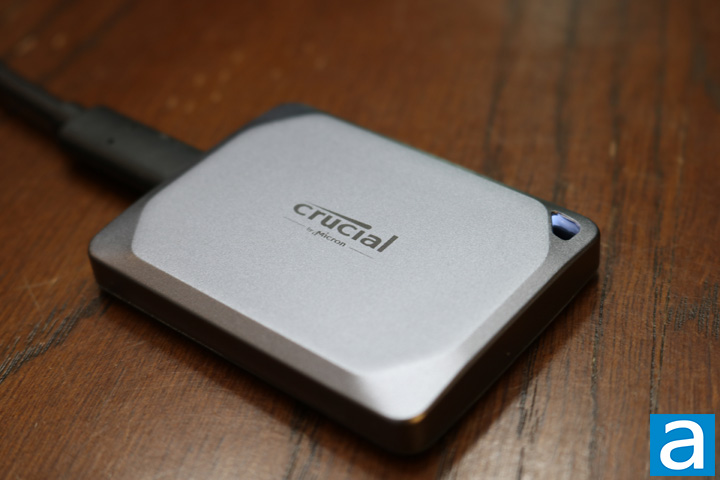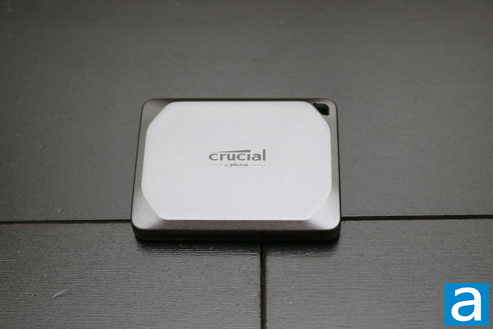 The Crucial X9 Pro 2TB has a sleek minimalist design virtually identical to the Crucial X10 Pro 2TB. Front and center is the Crucial logo on a matte aluminum background. The silver color of the portable SSD keeps it looking clean. Towards the sides of the SSD, the front angles slightly downward until it reaches the edge, which brings some depth to the design instead of having a flat front. There is a small cutout at the top right corner, which has an LED that lights up when the SSD is plugged in and can be used to attach to something like a lanyard. The overall build of the Crucial X9 Pro 2TB is solid and feels great. There is barely any flex to the SSD's enclosure.