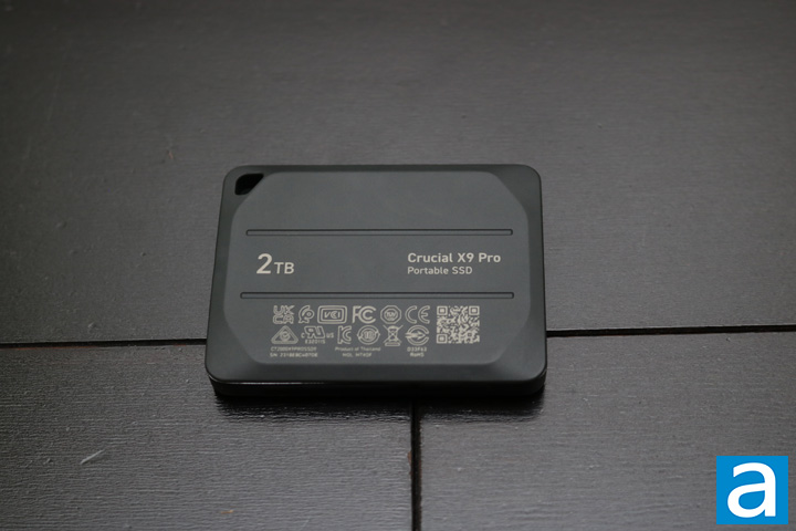On the back of the Crucial X9 Pro, we find a soft rubber coating. The rubber provides a small amount of grip on a table when the SSD lays flat. However, with its light weight, it can still easily shift around when intended. The capacity is placed in large writing. In our case, it is the 2TB model, but a 1TB and 4TB version can be bought as well.