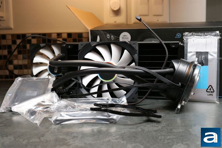 Out of the box, we find everything needed for a quick installation on either Intel or AMD motherboards. Other than the radiator and fans kept tightly in place to avoid any bumps during transportation, everything else is found in different plastic bags. The manual and a little product registration guide packet are packaged together. The product registration guide allows one to get an extended three-year warranty on top of the three-year warranty, which is quite a bit of time. The rest of the installation components are also divided up into separate plastic bags, making the entire process of figuring out which pieces are for what motherboard quite easy. Overall, I found the different components well packaged to keep them safe. All the different bits and pieces for installation are well organized as well.