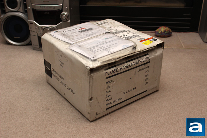 The CRYORIG A40 Ultimate arrived to us here in Calgary, Alberta, with its bigger brother, the CRYORIG A80. The "40" and "80" respectively refers to the 240 mm or the 280 mm radiators attached to each of these versions. The package arrived from New Taipei City, Taiwan, which meant it traveled quite a long way to arrive. For such a long time spent traveling, it arrived in decent condition. There were a bunch of dents and scratches all over the box, but the packing tape kept everything together, and there was no damage to the retail packaging, which is the more important part.