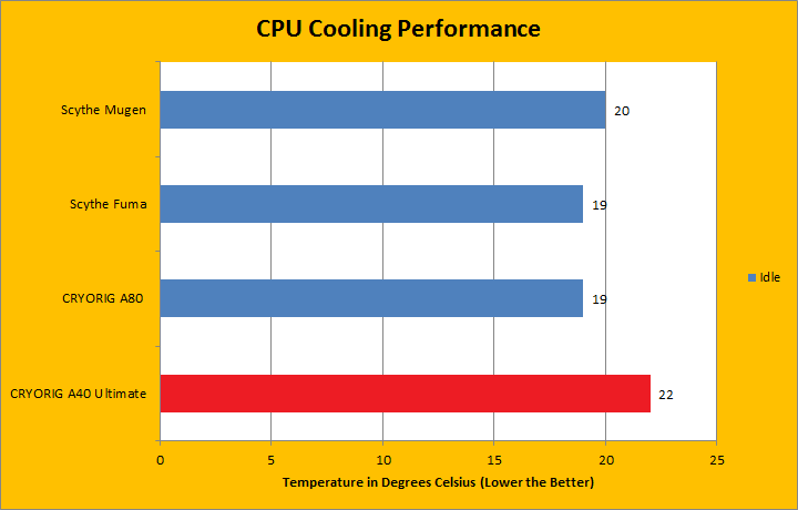 Comparisons were made to another water cooler and two air coolers, while as many variables as possible were kept constant. The only 280 mm cooler on the list is the CRYORIG A80, while the other two are quite large air coolers. They should give good references for comparison. The CRYORIG A40 Ultimate was mounted to the front of the case with both fans attached in a push configuration. The temperature results for each cooler was measured with CoreTemp, which reports the CPU's integrated digital thermal sensor for maximum accuracy. Each temperature result was calculated by taking the maximum value of the cores inside the CPU.