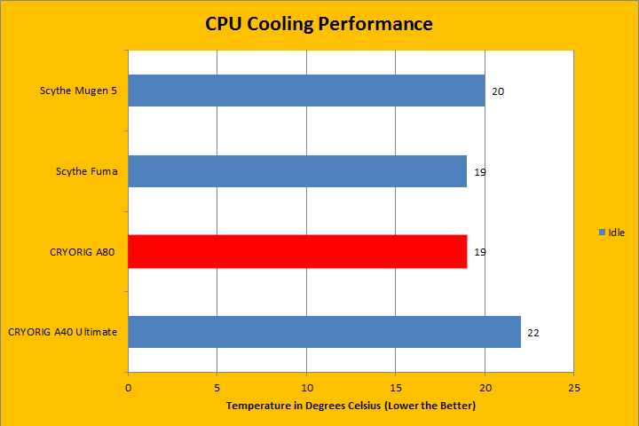 After installation and letting our computer sit idle, we recorded temperatures of approximately 19 degrees Celsius from the CRYORIG A80. While this is pretty low, this is not too surprising overall. Comparatively speaking, this was similar to the Scythe Fuma, while being three degrees cooler than the CRYORIG A40 Ultimate. Even so, these numbers were under zero-load conditions, so we went to our load tests to see what the A80 was actually capable of. Just to note, these idle numbers were also double-checked after our load test to ensure correct results.