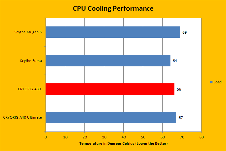 Powering Prime95 up and running the tests, the CRYORIG A80 immediately came alive, with all three fans spinning to keep the unit cool. After approximately half an hour to let the temperature stabilize, we finished with a maximum temperature of approximately 66 degrees Celsius. Comparing with the other all in one cooler, the A40 Ultimate, this number was quite similar all things considered, with a difference in temperature of only one degree. Interestingly, this is a 280mm radiator compared to the 240mm radiator on the A40 Ultimate, although the smaller radiator is thicker. What was surprising was how well the Scythe Fuma performed in comparison with the lowest maximum temperature of the bunch. This being said, you can see all of these coolers were within five degrees of each other, and at these full load conditions, this was still a pretty good result.