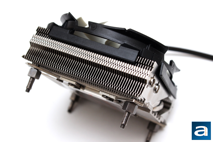 Out of the base of the C7 spur two heatpipes on each side. They bend out and go back through the array of fins on each side. This effectively makes four heatpipes in total. This symmetrical design also means mounting the C7 can be mounted in either of two orientations without worrying of affecting cooling performance. The heatpipes are 6mm in diameter, and like the base, is a copper core with a nickel plating on the outside. Heatpipes are supposed to efficiently lead the heat away from its source due to the low heat of vaporization, or phase change energy, of the fluid inside. The heatpipes are aligned in an alternating manner to spread out the heat in the single array of radiating fins. These pipes along with the fins and the fan attached should be able to dissipate heat quite well, at least in comparison to the stock options, but we will see if this is true in our performance tests.