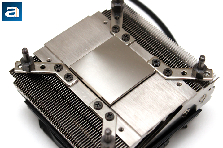 From the bottom of the CRYORIG C7 CPU heatsink, we can see how the fins and the pipes sit upon the base. The area in contact with the CPU is flat, which means the entire base should rest evenly on top of the processor. A quick inspection reveals there are no abnormalities, although it is not a clean finish either. The off-center milling marks can be seen as the light reflects off the bottom, but it is still relatively consistent. You probably also noticed there are four screws protruding from the base of the CRYORIG C7. This is used in the installation. In the photo above, it is set in position for Intel LGA1150/1151, but moving the screw around between other positions makes it compatible for other Intel LGA115x models. Unfortunately it is not LGA2011 compatible, which is kind of a bummer, but considering the market, and the very few mITX X99 motherboards, this is understandable. Moving the screws off the attached metal bars and into the four screws attached directly on the bottom also makes this cooler compatible with AMD's FM1, FM2, FM2+, AM2, AM2+, AM3, and AM3+ sockets.