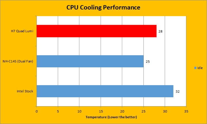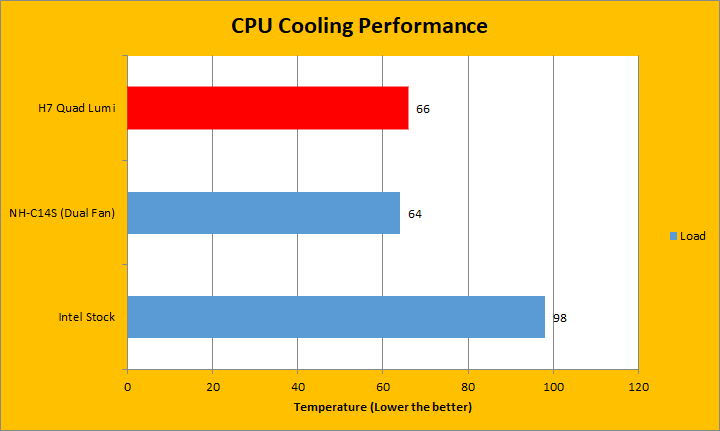 All tests were run in our custom built computer to best reflect real life performance. The computer remained in the same location in the same room throughout all tests. The room temperature in our testing lab was around 22c. Stock thermal paste respective to all coolers were used to rate its performance; all pastes were given a proper amount of time for them to fully settle. The fans on all heatsinks were directly connected to the motherboard's 4-pin connector. Computer was turned on and idling for at least one hour for the idling tests. High CPU load results were obtained using the Prime95 in-place large FFTs test with four worker threads for a minimum of ten minutes or until the temperature was deemed stable. Temperature results were measured with AIDA64, which reports the CPU's integrated digital thermal sensor for maximum accuracy. Each temperature result was calculated by taking the maximum value of the cores inside the CPU. We chose to compare it against the Intel stock cooler, especially as CRYORIG specifically makes claims of how much better the H7 Quad Lumi is compared to the OEM option. Finally, I have also compared my current heatsink, the Noctua NH-C14S, as it has a similar surface area to our unit under test today.