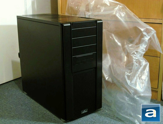 Marketed as a case for "high-end gaming PC users", the Cubitek XL Tank certainly looks the part with its sleek black color scheme for a subtle yet outstanding appearance. Measuring in at 230mm width, 490mm depth, and 525mm height, it is constructed from sturdy anodized aluminum, and has a distinct brushed finish (As visible in the following photos), which gives the case a feeling of luxury and high quality -- both in feel and physical appearance. This subtle effect accented the quality of the case material used. The front of the case is what you would expect to see in most chassis designs: A very clean and simple exterior with four removable panels for installation of 5.25" optical drives. Covering the lower half of the front panel is aluminum mesh, which incorporates a monstrous 240mm intake fan for optimum airflow under the hood. The Cubitek badge resides inconspicuously at the very base of the front panel.
