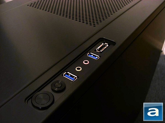 As seen in the above photos, Cubitek has made both a practical and stylish design choice by mounting the front panel connectors at the top of the case; this design gives the user easier access to the power buttons and USB, audio, and eSATA ports, and their alignment subtly complements the clean lines on the top panel. With such a setup, no longer do you have to fumble at the base of the front panel to plug in your peripherals. The power button especially seems to have been given considerable thought in design, and gives excellent tactile feedback when pressed.