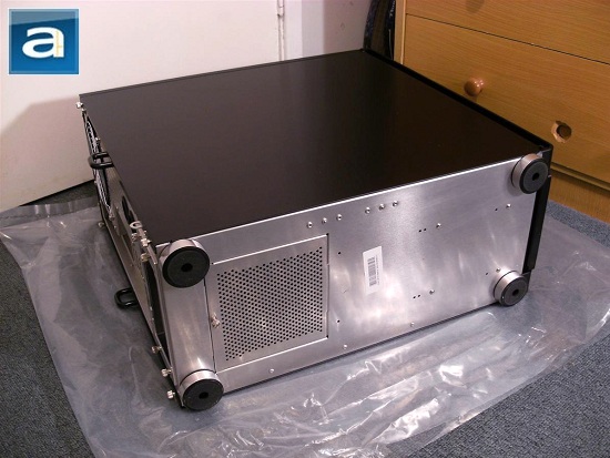 Laying the chassis on its side, the four low cylindrical feet on which this case resides on are clearly visible. They provide another level of airflow under the case, as well as also offering stability by preventing the case from sinking into or becoming somewhat unstable on deep pile carpet. Covering each foot is a layer of stiff plastic designed to minimize indentations and damage usually inflicted on the carpet from the sharp edges with which aluminum is typically finished. You can also see the sizable aluminum mesh panel located towards the rear of the base, and incidentally just under the location where a power supply would be installed. This also aids airflow, allowing power supplies with bottom mounted fans to quickly draw in outside air for cooling.