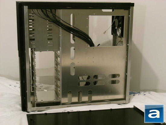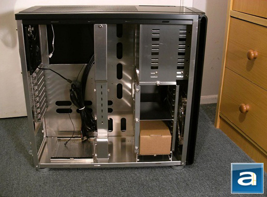 A large square opening is visible on the motherboard tray for easy aftermarket CPU heatsink backplate installation. The opening is also more than large enough for modern shifted CPU sockets on LGA 1155 and 1156 boards; this is evidence of a well-thought out case interior, as it caters for the whole spectrum of users.