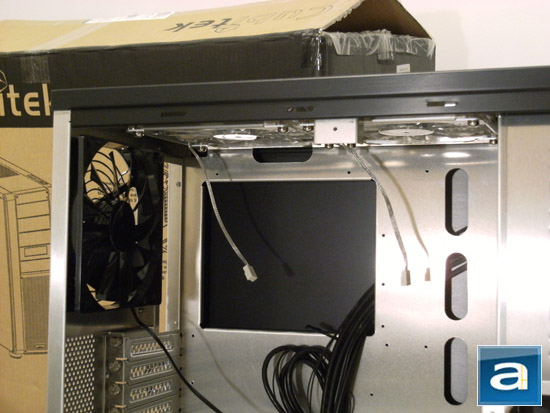 In their interior design of the XL Tank, Cubitek has implemented a number of useful solutions, making component assembly considerably more convenient for the end user. As seen in the photo above, the I/O connector cables are anchored at the same spot, which makes for easier and more aesthetically pleasing cabling. You can also see that the expansion cutouts are all secured by thumbscrews for easy expansion card installation. This is a great boon for users who, either out of necessity or simply because they can, have a habit of regularly swapping video cards and other miscellaneous cards. Also clearly visible is the VGA card retention beam. If you have ever used a heavy, full-sized, multiple-slot video card, you will most likely be aware of the adverse flexing effects the weight of the card has on its own PCB, an increasing occurrence in this age of high-performance video cards. The bracket tilts out from its base once the two thumbscrews that hold it in place are removed. Once the motherboard is installed, it is simply a matter of unscrewing one of those convenient expansion cutouts, placing the video card into its respective PCIe x16 slot, and lowering the bracket into place. That's it. Say goodbye to PCB flex!