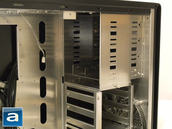 Moving towards the right side of the interior, we see the six 3.5" and four 5.25" drive bays. In keeping with the trend of tool-less installation in this case, it is no surprise to see that all drives are fixed into their respective bays using thumbscrews. Included in the cardboard box as seen in the first photo above is a small bag containing twenty rubber washers, designed to prevent vibrations during hard drive operation. You will still be able to use the supplied screws to affix the washers to the hard drive, but once that step is completed, it is simply a matter of slapping the hard drive into an empty 3.5" slot and sliding the side bracket across to lock the drive in place. I was concerned that these measures taken by Cubitek would not be enough to secure the hard drive; sure enough, there is still some minor give when installation is completed, but nothing that should worry you. Heck, if you were rattling the case around enough to worry about the hard drive being dislodged, all I can say is that the hard drive falling out would be the least of your worries.