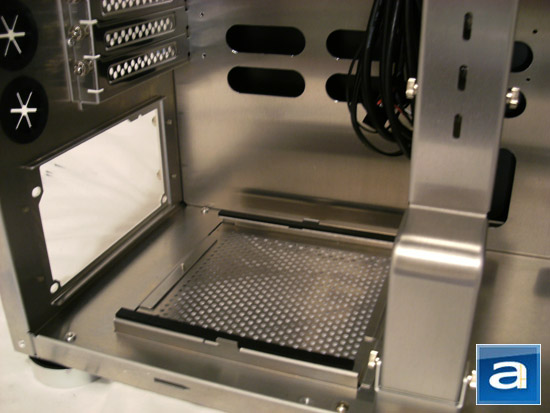 Clearly visible in the photo above are the two rubber-covered rails on which the power supply sits after installation. This dampens any possible vibrations produced when the power supply is in operation, hence minimizing noise output. We can also see the large removable aluminum mesh panel in the space between the rails, which is placed in that location to enhance airflow for power supplies with bottom mounted fans. A square piece of thin foam, roughly the same dimensions as the mesh panel, can be screwed in place above the panel to act as a dust filter.