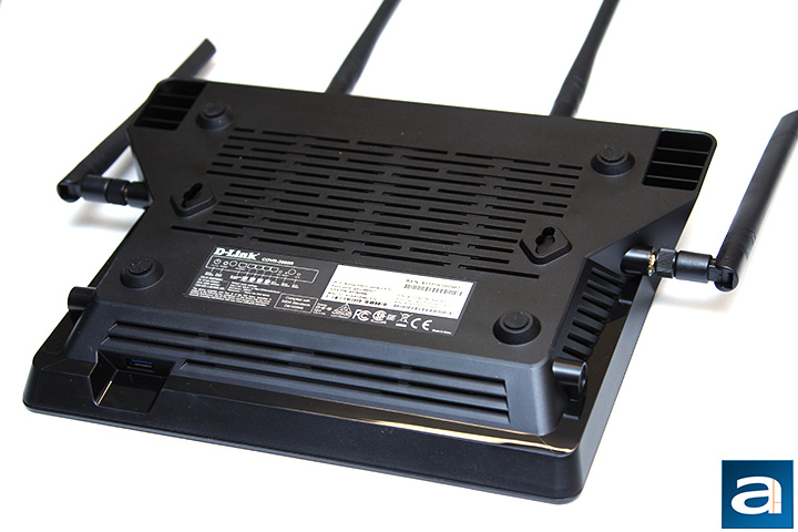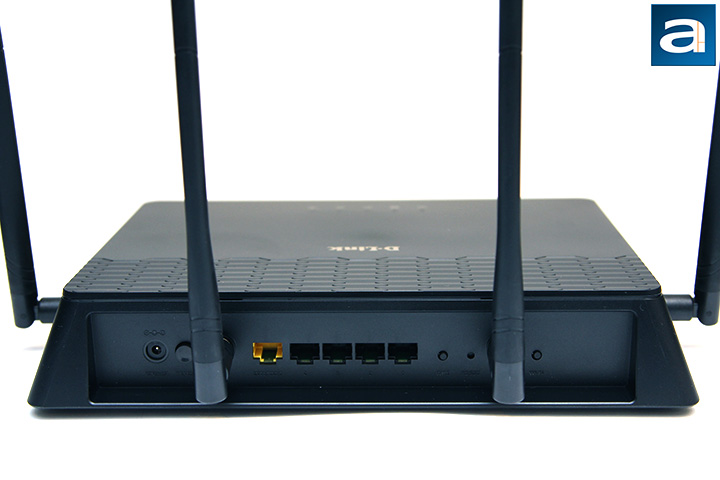 Turning the D-Link COVR-2600E around, we can take a closer look at the four dual band antennas attached to the router along with a generous array of ports and switches. These include a 12V DC power input, power button, one Gigabit uplink port, four Gigabit Ethernet ports, Wi-Fi Protected Setup button, one USB 3.0 port, reset button, and a Wi-Fi on/off button.