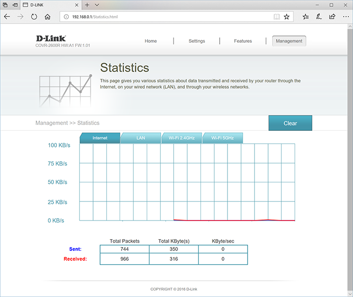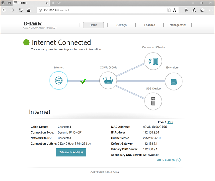 The novelty of owning a D-Link Covr is not its advanced firmware and features, but rather its ease of use for the general consumer. In fact, the Covr has no advanced configuration features, nor is it DD-WRT compatible. To start, simply power up your router and extender. The extender is already paired to the router out of the box, and everything worked flawlessly immediately after turning them on. Unlike mesh offerings from major manufacturers such as Linksys or TP-Link, an internet connection is not required for initialization, nor is a smartphone. All you need to do is navigate to the router's local IP at 192.168.0.1 from your computer's browser. There is a mobile app available, but it only contains a subset of the features available in the web configuration interface. As such, I stuck with the web browser.