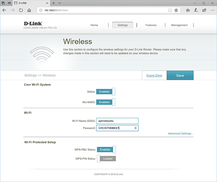 Under the Settings drop-down menu are five options, which includes Wizard, Internet, Wireless, Network, and USB Sharing. Wizard is a step-by-step process for you to configure the Covr Wi-Fi system. In Internet, you can configure your internet type, such as Static, Dynamic, PPPoE, PPTP, L2TP, or DS-Lite for both IPv4 and IPv6. Our screenshot above shows the Wireless screen. Here, you can enable or disable Wi-Fi, enable or disable MU-MIMO, configure the Wi-Fi SSID and encryption key, and toggle Wi-Fi Protected Setup options. Both bands operate on the same SSID. Hitting the Guest Zone tab will allow you to configure a separate guest network for each band. This provides a second virtual wireless LAN that can run in access point isolation mode to limit user access to internet only.