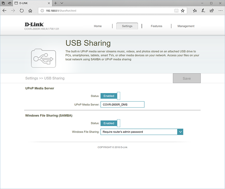The last section under Settings is USB Sharing. External storage devices can be added to the Covr by the USB port in front, and you can enable Windows File Sharing and configure a UPnP media server to the connected storage device. These options are extremely primitive and will not instantly transform your USB hard drive into a full-blown network attached storage system, but it definitely passes as a poor man's solution for those who are looking for some extra convenience.