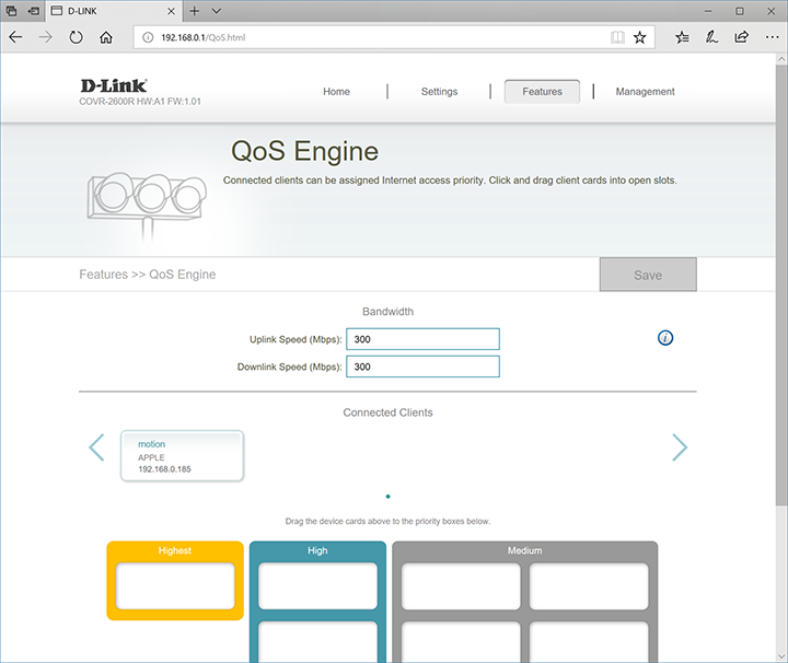 Up next is the QoS Engine page under Features. Other sections under Management include Firewall, Port Forwarding, Website Filter, Static Route, Dynamic DNS, and Quick VPN. As it can be seen in our screenshot above, you can limit the universal uplink and downlink speed as well as dragging connected clients onto a priority tree for quality of service. Again, this is as straightforward as it gets, although I doubt the usefulness of having a universal bandwidth limiter.