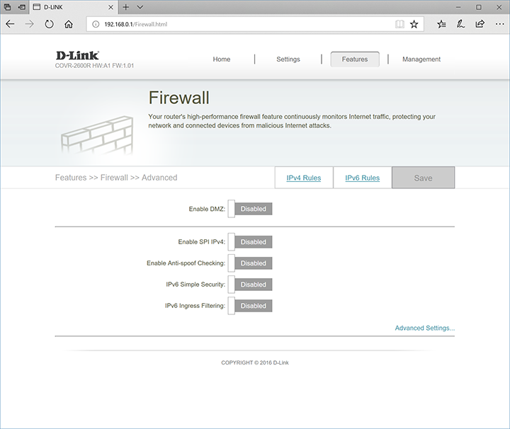 In Firewall, you can toggle DMZ, SPI IPv4, Anti-Spoof Checking, IPv6 Simple Security, and IPv6 Ingress Filtering as shown in the above screenshot. Clicking the IPv4 and IPv6 tabs will bring you to a page where you can set rules so traffic can be denied or allowed through local area network devices. In Port Forwarding, not shown, you can set virtual server and port forwarding rules. The remainder of the sections should be self-explanatory in accordance to its name.