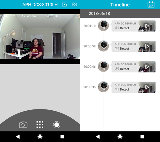 If you tap the play button near the top right side, you can see the timeline of past triggers and review the videos recorded from there. As you can see, D-Link has already picked me up multiple times from just sitting here. The calendar in the top right corner of this menu will allow you to go back further in days, depending if you have the local storage installed or if you have a longer subscription plan.
