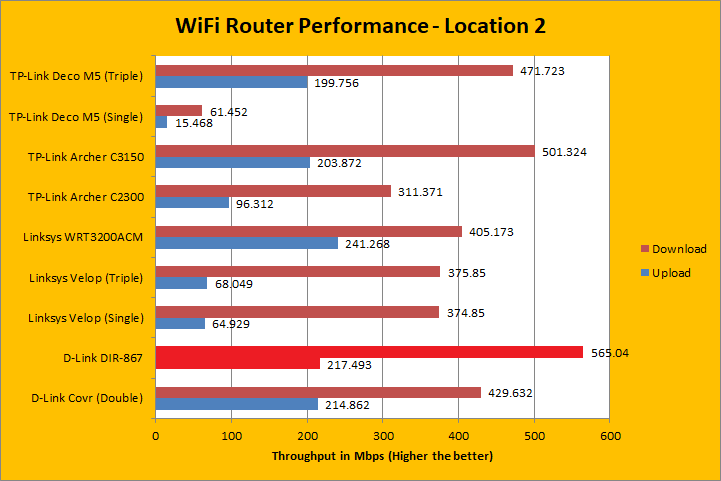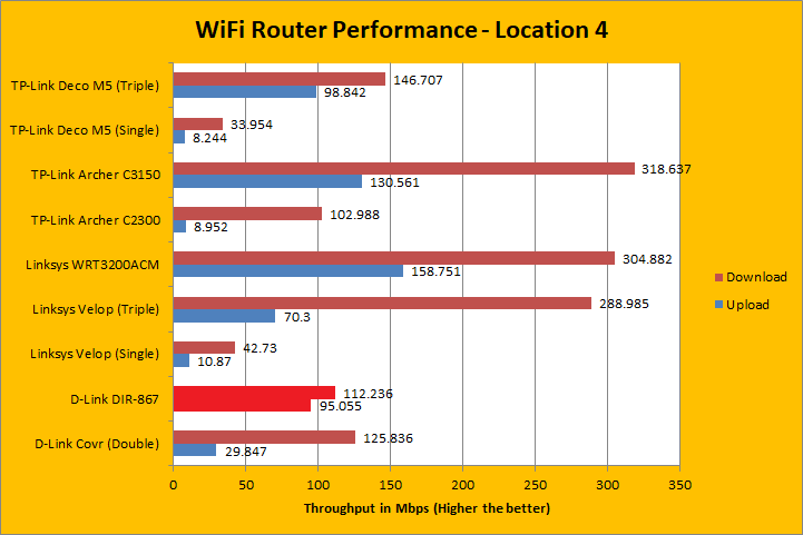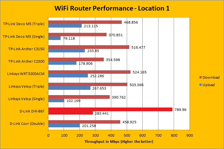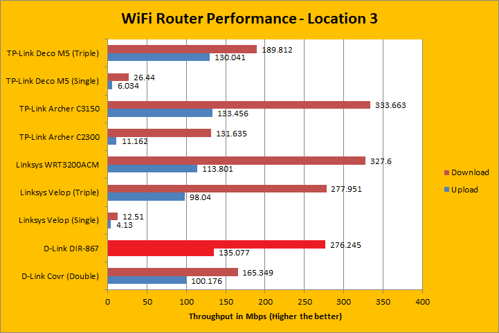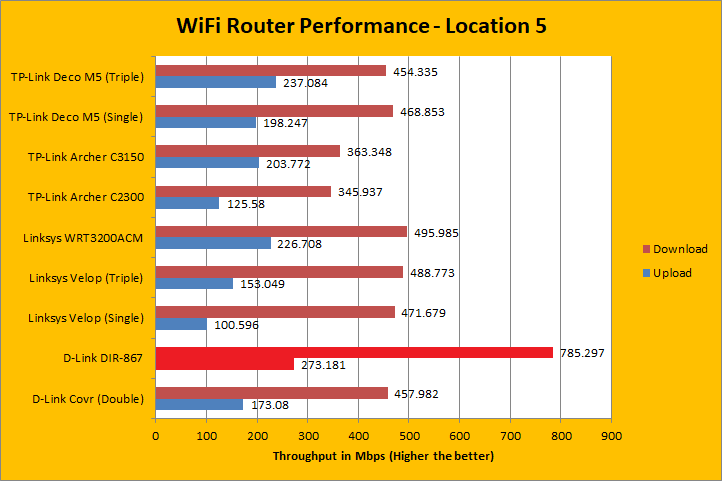 In Location 1, the D-Link DIR-867 delivered the highest throughput; besting even the venerable Linksys WRT3200ACM. The same went for Location 2, where the D-Link DIR-867 pushed a higher download speed than both the WRT3200ACM and TP-Link Archer C3150, although its upload speed was not as good as the Linksys performance router. Location 2 and Location 5 are almost just above or below the router, respectively, showing the DIR-867's antenna array strength when the MacBook Pro is not just adjacent to the device, but also on top and below. The D-Link DIR-867 seemed to do very well when the laptop is below it, with its download speed nearing 800Mbps. In Location 3, D-Link's DIR-867 outperformed the WRT3200ACM in upload by a good margin, but was unable to match its download speed. Location 4 is a tricky scenario, where the distance is not only the longest compared to all the other locations, but the laptop is also located a level below the router. That said, a few glass windows in between help with the signal. In this case, both the WRT3200ACM and Archer C3150 had considerably better range compared to the DIR-867, where the budget D-Link router finally fell behind the considerably higher priced routers.
