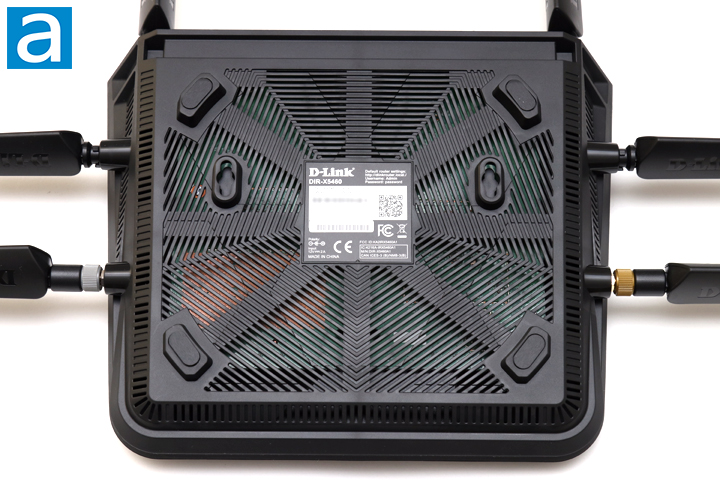 At the bottom of the D-Link DIR-X5460, you can find even more ventilation slits for a mostly hole-filled base. Four integrated plastic feet can be found here with rubber bottoms providing about half a centimeter of clearance between the router and the surface it sits on. Two mounting holes can be found in between the feet, which will let you wall-mount the router if you so desire. In the middle of the base is a label showing information like the serial number, default SSIDs, and default Wi-Fi password. I would probably tell you to change your password and SSID, which is possible using the web configuration interface, but you will start off with these configuration settings.