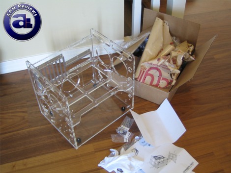 The assembled unit. Loads of garbage left from the packaging on the side, haha. Anyway, you can see the simple design and construction idea of the Danger Den Torture Rack -- a total of five pieces of clear acrylic can make a computer case. It feels very solid after assembly and does not wobble, and dependable to accommodate your computer components even for transporting from one place to another such as a LAN parties.