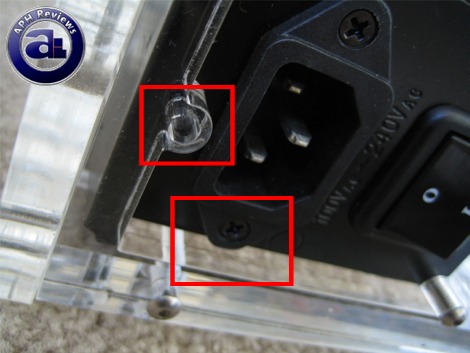 The power supply we installed is a Tagan TurboJet 1100W power supply. The height of this power supply is exactly the same as the height between the bottom piece and the middle piece. As you can see in our photo above, the case edge is actually very tight with the plastic piece at the perimeter of the male power input socket. This way it will affect alignment with screw holes.