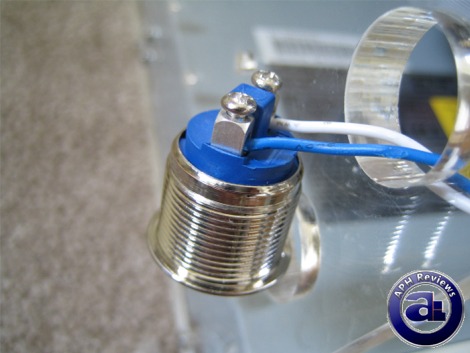 The reset button (I use it as a power button). You'll need to attach the cables to the switch yourself; but it is as simple as loosening the two screws and sliding it through, ensuring that proper contact between the metal are made. This switch can be installed in four different areas of your Danger Den Torture Rack; two accommodation holes are on each of the left and right side walls.