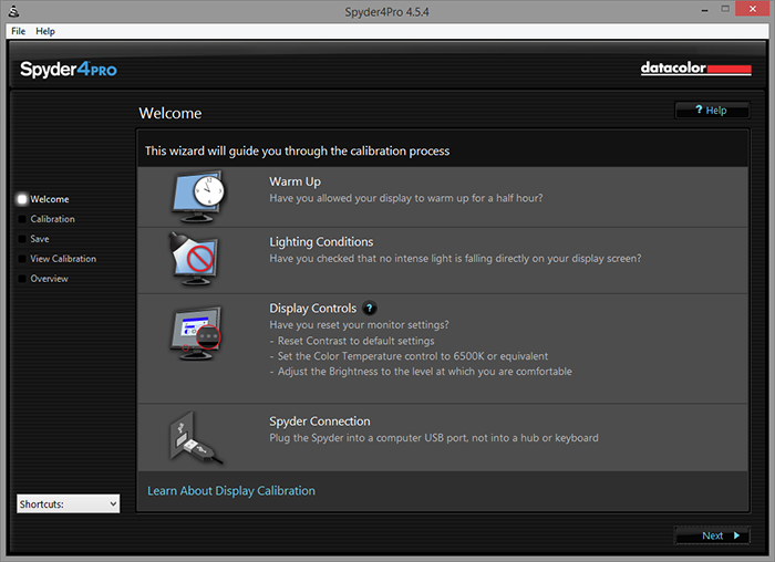 For the first time you run the Spyder4PRO software on your computer, you will see the same screenshot above, except you need to check each section off individually to ensure you have acknowledged all of them. Subsequent times will allow this to be bypassed, where you can simply hit "Next" to continue.