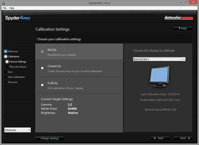 Next, you can select the calibration procedure you would like to execute. Since my monitors were already calibrated when I took the screenshot, it has three options. This includes ReCal, CheckCal, and FullCal. Recalibration, as its name suggests, allows you to recalibrate a previously calibrated display by your Spyder4PRO. The advantage of this compared to a full calibration is it takes half the time required. Just for your reference. a full calibration will take approximately five minutes to run. This is not a big deal, but for those who have set a reminder to recalibrate their display every two weeks, then it will be less of a hassle. On the right, you can configure which monitor you would like to calibrate from a drop down menu. The window will then automatically move to the display you are calibrating, given that you have multiple displays connected, of course.