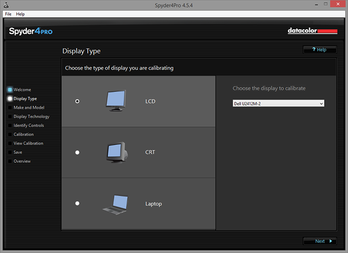 If this is your first time running your Spyder4PRO, the wizard will ask for more information about your setup. Everything is very straightforward, although it will really speed things up if you know a little bit about the technical specifications of your monitor beforehand. Thankfully, even if you have no idea what is going on, it will not stop you from continuing. Our screenshot above is a dialog that lets you select your display type, which includes LCD, CRT, and Laptop. Obviously, your laptop uses an LCD screen, but the options available in the subsequent menu will be slightly different, depending on your selection.