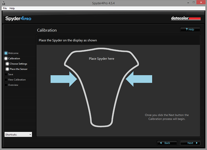 Once the necessary information is entered, the software is ready to work with your hardware colorimeter. A footprint of the Spyder4PRO will be displayed on the screen, as you can see in our screenshot above. If your LCD monitor is placed completely perpendicular to your desk, I would highly recommend you to tilt it back slightly, so the Spyder4PRO can rest on the screen comfortably. Otherwise, you will just be sitting there for five minutes with the colorimeter pressed against your screen, which is a pretty boring task, haha. This is not to mention you might block out the ambient light sensor, and prevent proper measurements in this regard. Anyway, once your Spyder4PRO hardware is in its place, hit "Next" to continue.
