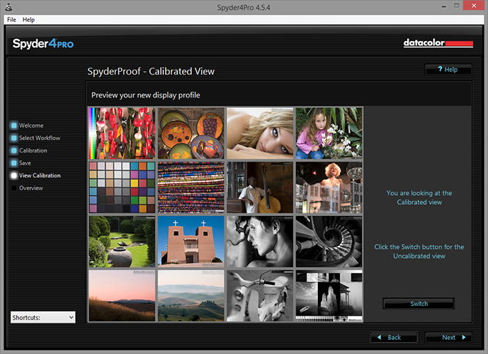 Once the calibration process is done, hit "Finish", and it will exit full screen mode to return to windowed mode. Here, you can switch between calibrated and uncalibrated view to see what changes have been made. The matrix of photos allows you to make a quick visual comparison, which is quite convenient. If you are happy with the results, hit "Next" to take a look at more quantitative statistics about your newly calibrated display.