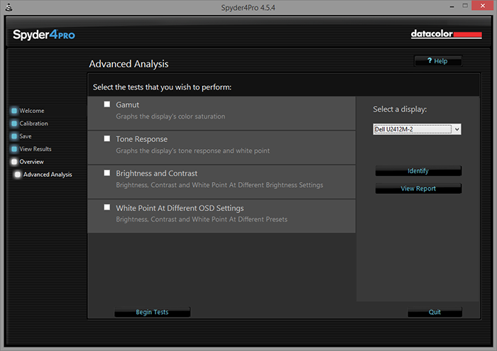 For those who are interested, hitting the "Advanced Analysis" button will allow you to perform additional tests on your display. This includes gamut, tone response, brightness and contrast, as well as white point. I found them to be pretty useful in performing an analysis of my monitors, and it will produce quantitative results or graphs in the end, depending on the test. For example, I used the brightness and contrast test to equalize the intensity of my two displays sitting on my desk.