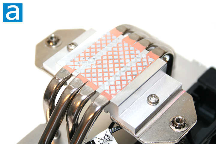 The photo above shows the bottom of the DeepCool AK400. Here, we can see the configuration of the heatpipes with respect to the base due to its direct contact heatpipe design. Orange copper strips are seen across the base. The base is reasonably flat for what it is worth, but there are ridges for the simple fact this heatsink has direct contact heatpipes. Overall, the contact base surface is clean. Thermal paste is pre-applied on the contact base, as seen in the photo above. A separate tube would have been preferable, but this is a budget cooler.