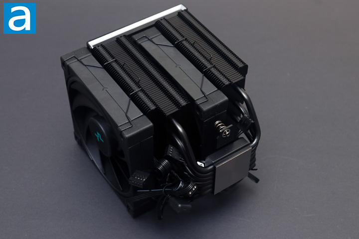 Our DeepCool AK620 Digital is quite familiar, as it keeps the same heatsink design as the original DeepCool AK620. As such, we have a dual-tower design. However, as this is the Digital edition, we have a large flat panel that covers the top of the fin stack. This panel makes the whole AK620 Digital look even cleaner than what we have seen in the past, as it is just a flat and glossy panel with no other accents when unplugged. There are no logos visible from this angle, although this changes once the panel is powered, as you will see later on. Both stacks of fins are black in color, rather than the silver aluminum we saw on the vanilla AK620. This is because the AK620 Digital uses their Zero Dark version of the cooler under the digital screen. This is similar to Noctua's chromax.black effect with an all-black finish. The fans are black as well with a blocky frame to maintain this angular design and prevent some airflow from leaking out of the sides.
