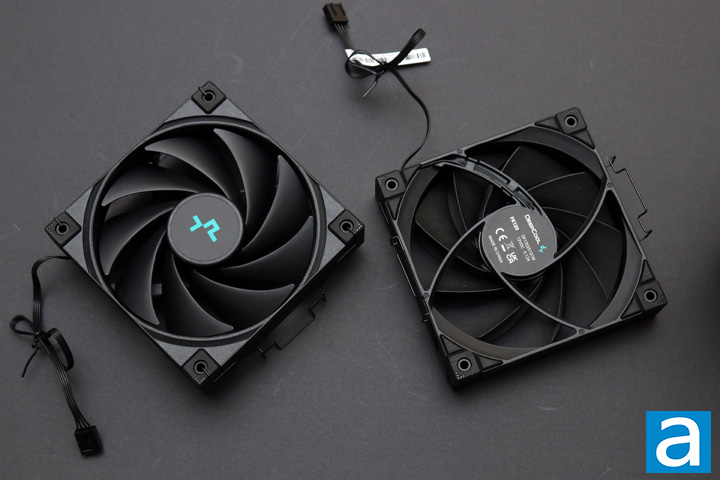 As for the fans in question, we have two 120mm DeepCool FK120 fans. Internally, we have fluid dynamic bearings for a longer lifespan and generally quiet operation. These 120mm fans have a specified rotational speed of 500 to 1850 RPM, maximum airflow rating 68.99 CFM, and maximum air pressure of 2.19 mm H2O. The rated fan noise is around 28 dbA. These rated numbers are pretty typical for a radiator or heatsink mounted fan, as these sorts of fans require a sufficient amount of static pressure and airflow to get air through the fins. The rated lifespan of these fans is around 50,000 hours, which translates into around 5.7 years if operated 24/7. Otherwise, the fans are all black and have a very blocky frame design to match with the squared off look of the AK620 Digital. The corners have rubber padding to reduce vibrations between the fan and the heatsink it is mounted to. Interestingly, DeepCool has updated the labels from the last time I saw these fans with just its logo in the center of the impeller.