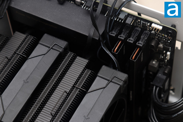 Afterwards, with the fans removed from the fin stack, you can place the whole AK620 on top and screw the unit onto the mounting bars. You will probably need an L-shaped screwdriver that is long enough to reach. Be sure to tighten these screws in an alternating fashion to evenly attach the heatsink to the metal bars. Next, you can install the FK120 fan in between the two towers with the wire clips. Afterwards, install the top digital panel, as you need to route the cable into the grooves on the front stack of heatsink fins. Finally, mount the last fan at the front. As I have pointed out before, the front fan hovers over my RAM, but it does not interfere as my memory kit is very low profile.