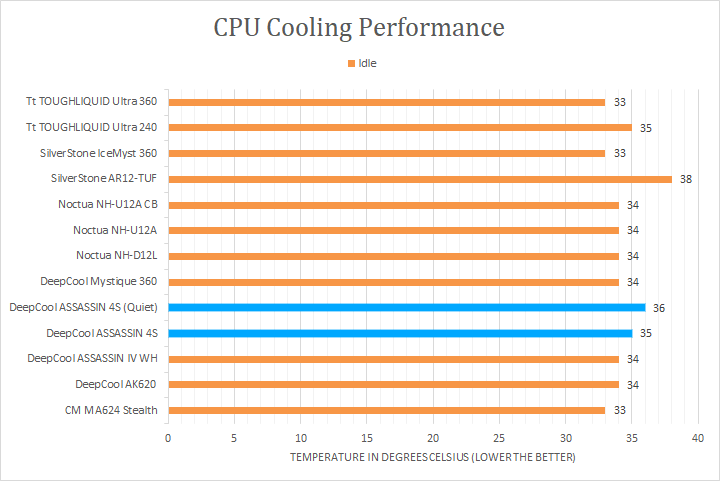 After letting my computer sit idle for a while, I checked the temperature of the processor. From the first graph, you can see with the DeepCool ASSASSIN 4S on top of the processor, my CPU idled at a temperature of 35c. Unsurprisingly, this is slightly warmer than the ASSASSIN IV WH. Changing the switch to quiet mode increased the processor's temperature by another degree. However, idle numbers do not give a full representation of what CPU coolers can do, so we started up the Prime95 tests to see the more pertinent results.